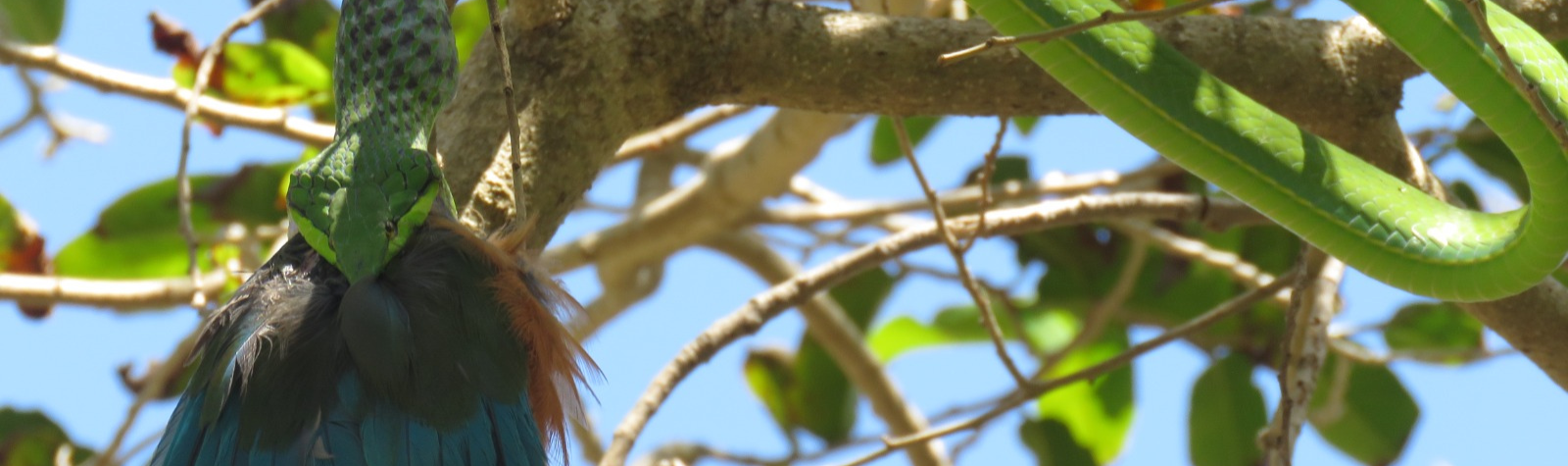 Especie: Serpiente Bejuquilla Verde (Oxybelis fulgidus) Pájaro Toh (Eumomota superciliosa) Oportunista (Agelaia yepocapa) Evento: Comportamiento necrófago de Agelaia yepocapa tras intento de depredación. Observación de…