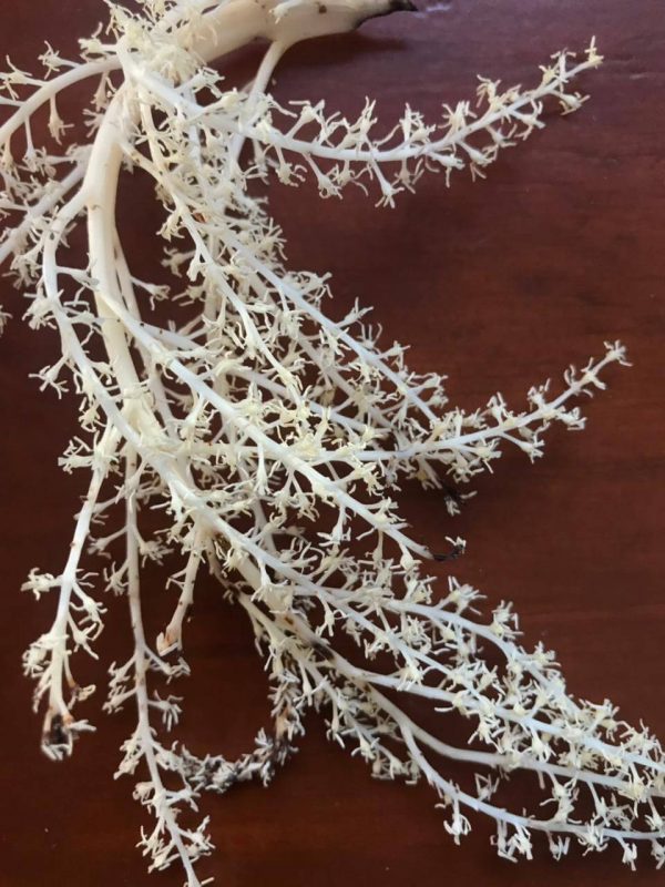 - Flores: Presenta pequeñas flores hermafroditas (5 mm) de color crema.